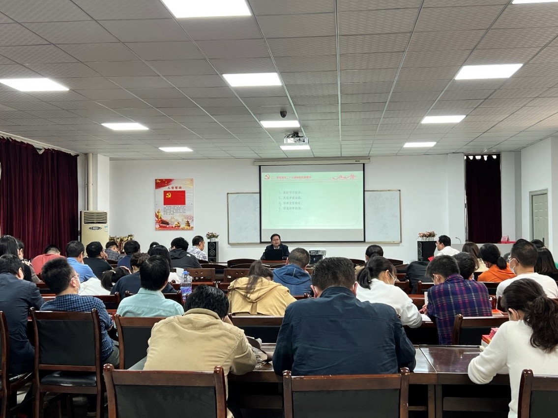 11月10日下午,英国上市公司官网365举行学习贯彻党的二十大精神专题党课,公司党委书记孟三爱以“高举旗帜的政治宣言,续写复兴的行动纲领”为题,向全体教工党员宣讲党的二十大精神。
