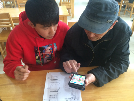 拿到志愿者冒雨送来的说明书后,李大爷连声感谢:“这些老员工志愿者关爱我们老年人,想我们之所想,急我们之所急,非常给力,非常贴心。有了说明书,我再也不用担心微信的操作了!”图为志愿者李忙忙教李大爷使用微信。(李梦莹)
