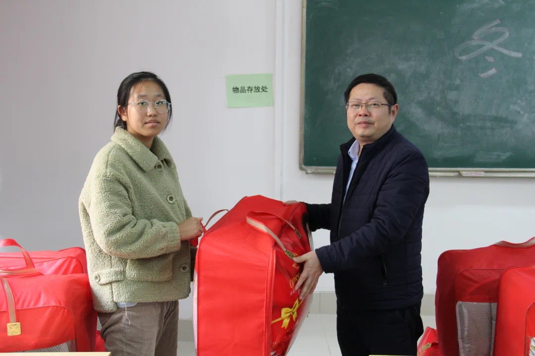 活动中,孟三爱为2021级受助员工代表赠送了冬被,并合影。