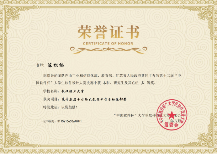 第十二届“中国软件杯”大赛历时一年,共吸引来自全国31个省份的800多所高校、5767支赛队参赛。经过初赛评审和总决赛晋级评审,公司3支参赛队从众多队伍中脱颖而出,最终“论文写了么”队(参赛队员:宋睿、谢李航菲、左新宇、许骞龙,指导教师:盛钟尹)获“A6智慧校园—综合服务学工平台”赛道全国二等奖,“仙舟”队(参赛队员:苏圣博、龙京松、谈利鑫,指导教师:陈松楠)和“8512”队(参赛队员:王玲、杨月娟、高颖、胡艺钒,指导教师:陈松楠)均获“A1基于龙芯平台的大数据平台自动化部署”赛道全国三等奖。