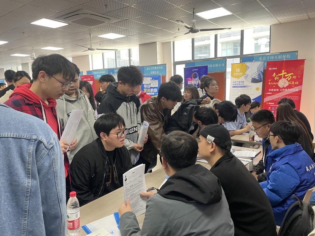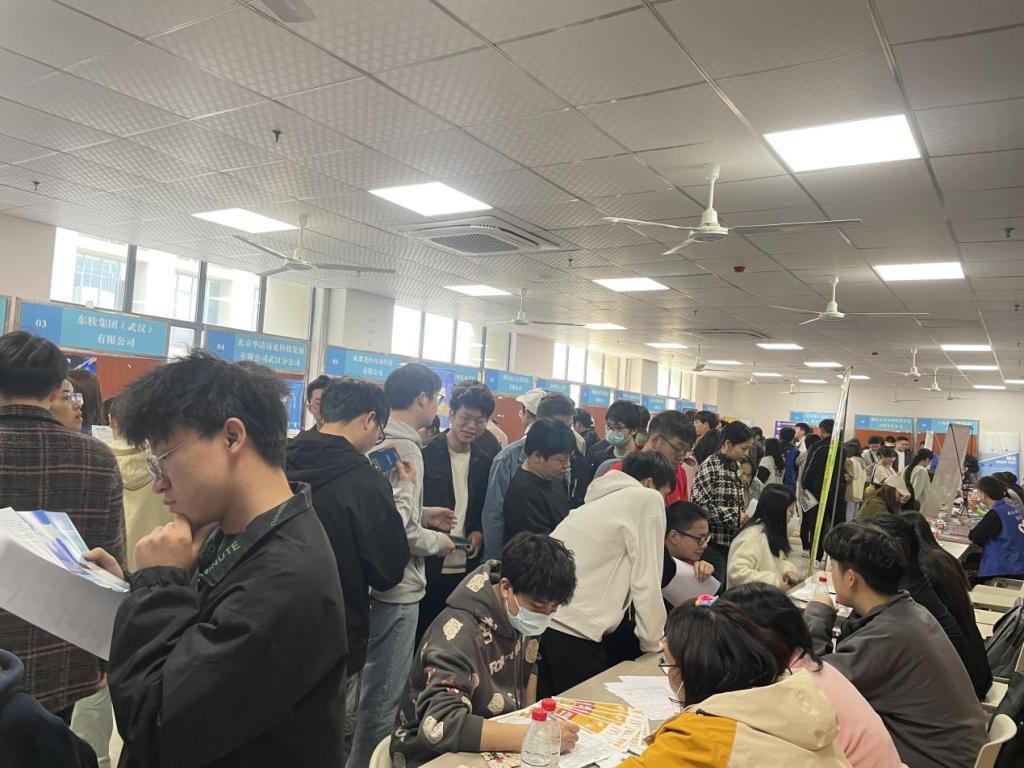 招聘会从上午十点开始,现场春意盎然,人头攒动,同学们求职热情高涨。招聘企业通过宣传展板、招聘手册、现场宣讲等方式向毕业生推介公司情况、岗位需求和薪资福利待遇,并与大家面对面沟通交流,耐心解答同学们关心的问题。毕业生手持简历,在东软集团(武汉)有限公司等多个专业对口企业面前驻足排队,企业招聘工作人员认真筛选和评估员工的简历,充分认可员工的综合素质和专业技能,并尽快安排面试聘用部分优秀学子。