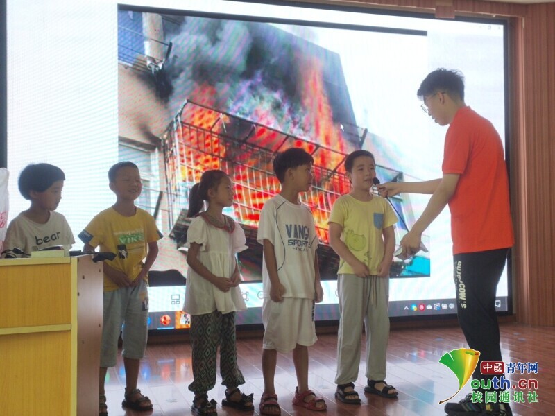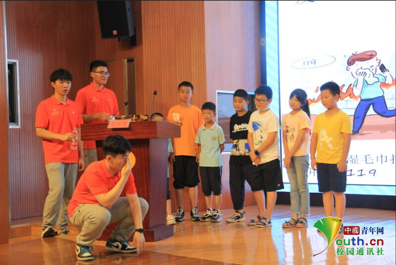 图为志愿者带领小朋友们做消防模拟演习(来自黄花中心小学) 中国青年网通讯员 贺虎 摄