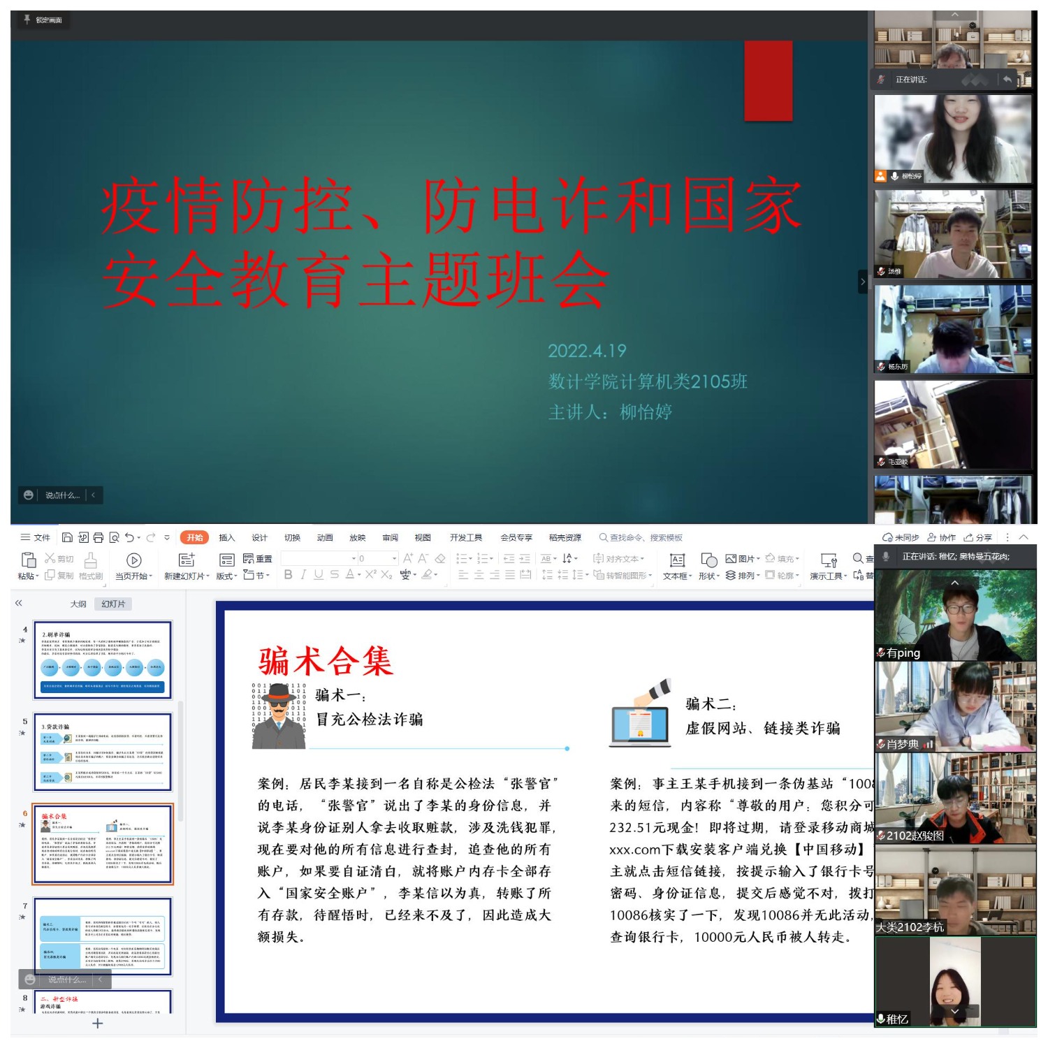 围绕反电信网络诈骗,公司还将疫情防控、国家安全日等安全教育内容纳入班会之中。同学们通过国家安全教育云基地数字资源,集中学习了国家安全相关知识,进一步提高了同学们的国家安全意识与保密意识。在疫情防控教育中,同学们共同学习了第五版疫情防控技术方案,大家纷纷表示,会以主人翁的意识,共同维护校园安全,努力创建零疫情校园。