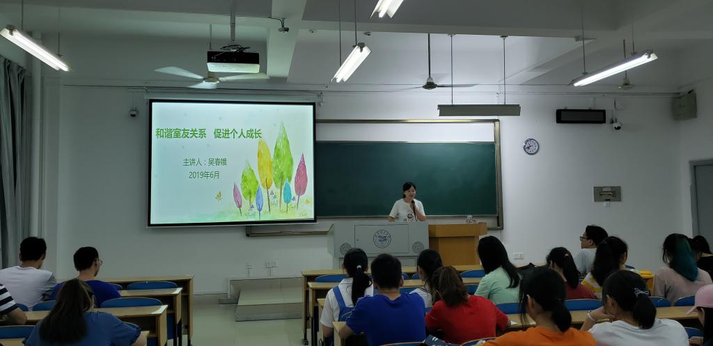 本网讯(通讯员邓浩))6月21日上午,公司2018级辅导员吴春娥老师在基础楼103教室召开主题为“建设和谐室友关系 促进个人成长”讲座。2018级全体寝室长、生活委员参加了讲座。