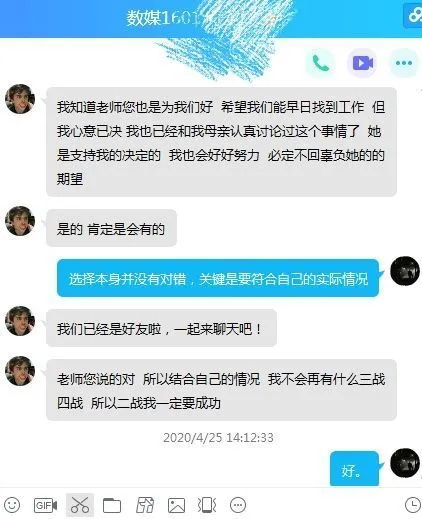 会议从下午2点一直开到6点。部分员工长时间线上等待,导致手机停电,会后还专门向老师发来信息,报告自己的论文和就业进展,师生互动有序而融洽。