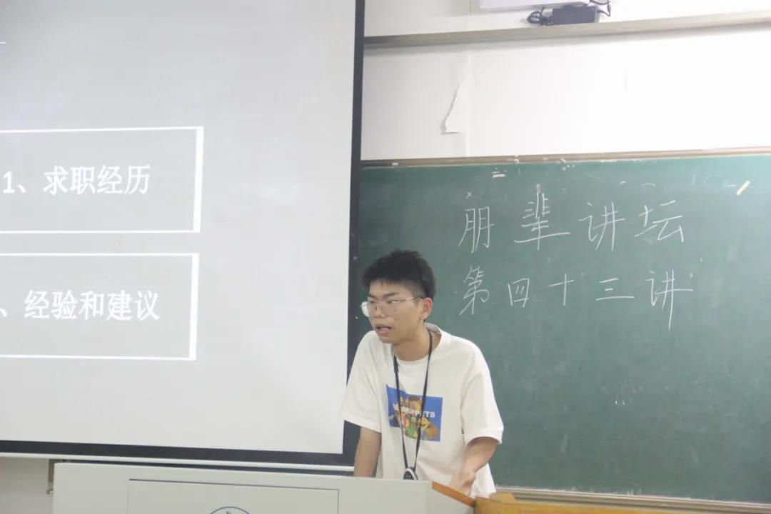 来自机械公司的林炳琛已经成功签约百度。他首先讲述了自己为热爱计算机专业,选择跨专业择业的经历。他指出,“兴趣是最好的老师”,他鼓励在场同学多做尝试,找到自己喜欢的方向并为之努力。他强调:“项目经验,实习经历不仅可以很好地丰富简历,还可以跨过很多求职的门槛。”