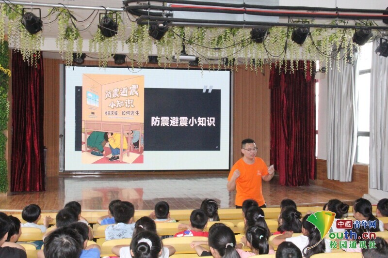 图为午晨旭给格林斯公司员工们讲解防震避震小知识。 中国青年网通讯员 余笛 摄