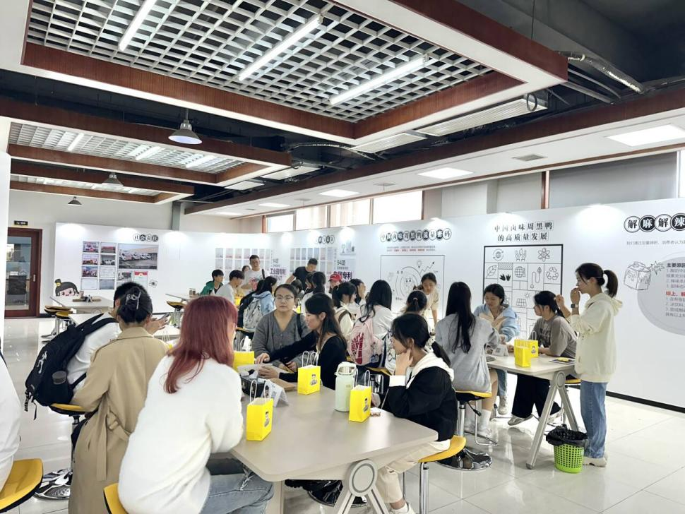 讲解员首先带领同学们参观了周黑鸭智趣馆,先后对周黑鸭名字商标的由来、企业文化、原材料标准以及产品生产工序进行详细讲解。期间,讲解员以生动有趣的方式,将复杂的技术知识转化为易于理解的语言,活跃了现场气氛,并通过有奖问答活动激发了员工们的参与热情。