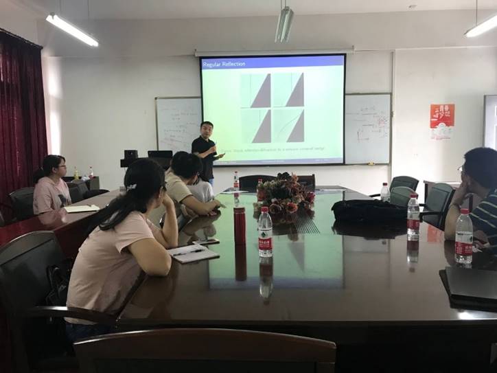阮立志老师以Hyperbolic wave patterns of Euler-type equations为题,向伟老师以Uniqueness of regular shock reflection为题,匡杰老师以Onsteady supersonic flow past a curved cone: isothermal case为题,分别做了精彩的学术报告。报告会结束后,三位专家与公司师生就“欧拉类方程的双曲波模型”、“奇异反射激波的唯一性”、“稳定超音速流曲线:等熵情况”三个学术专题进行了深入的探讨。