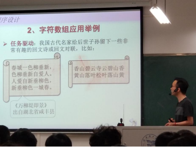 胡瑞鹏老师以出自湖北省咸丰县的一首有趣的古诗《万柳堤即景》:春城一色柳垂新,色柳垂新自爱人。人爱自新垂柳色,新垂柳色一城春。和一幅对联:香山碧云寺云碧山香,黄山落叶松叶落山黄。为引,让员工先感受一下回文古诗和回文对联的美,然后能够充分理解回文串的特点,进而进入编程例题--用程序实现回文串的判断。既让员工充分掌握了回文串的收尾字符完全相同的特点,又为其求编程中实现的方向与道路。这样中由古诗文联入题,引入到学习中的计算机知识,不落窠臼的同时,也不失为新颖的模式,使得我们在实现思政课的同时也多了一份古韵。