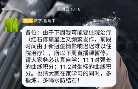 这条消息的发件人正是程建中老师,直到此时同学们才明白程老师之前几个月一直都是强忍着病痛在为大家授课。简简单单的一条信息,把一位老师的爱心、责任表现得淋漓尽致。